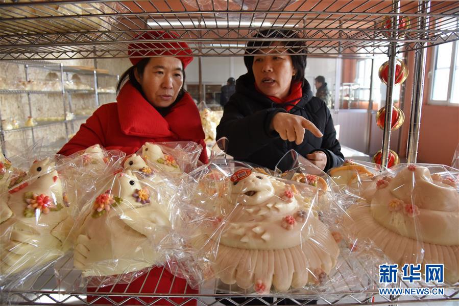 1月8日,工作人員準(zhǔn)備將做好的花餑餑放入蒸箱。 新華社記者 李紫恒 攝