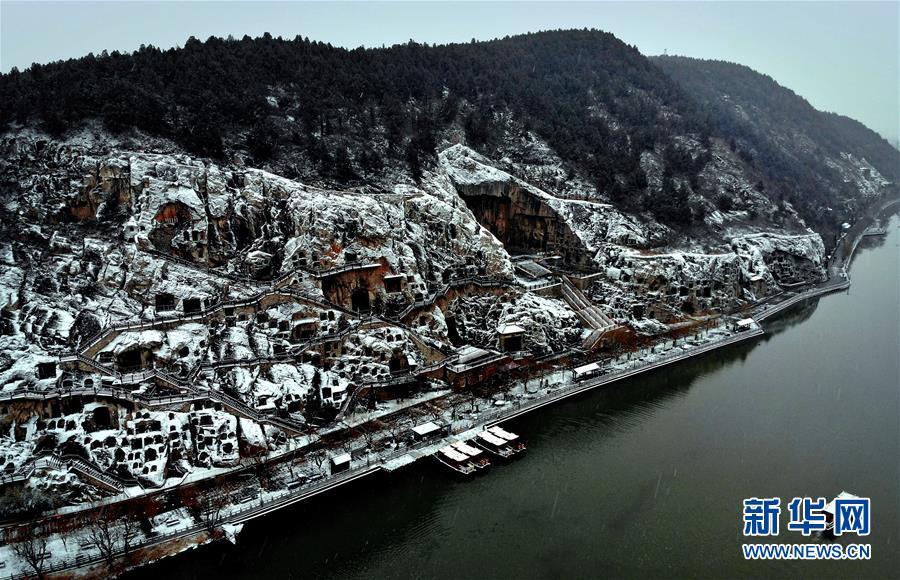 1月9日無人機(jī)拍攝的洛陽龍門石窟雪景。 新華社記者李安攝