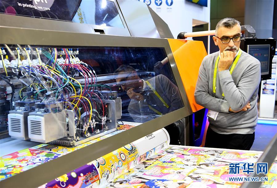 1月8日,在德國法蘭克福家紡展上,一名展商站在一臺紡織數(shù)碼印刷機旁。