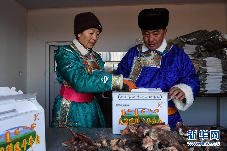 1月9日,牧民伊拉代(右)和妻子斯琴高娃在包裝風(fēng)干好的牛肉。 新華社記者 劉磊 攝