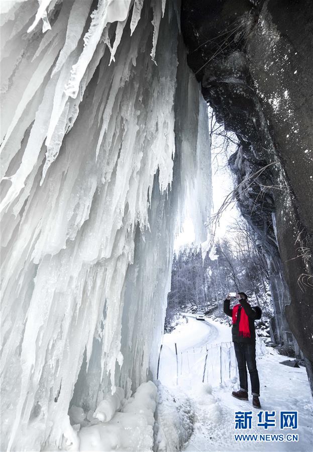 游人在吉林省長(zhǎng)白縣十五道溝望天鵝景區(qū)內(nèi)拍攝冰瀑景觀(1月3日攝)。新華社記者許暢攝