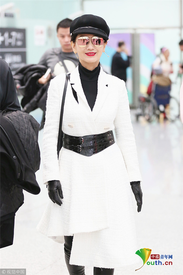 1月10日,廣東省深圳市,趙雅芝夫婦現(xiàn)身深圳寶安機(jī)場(chǎng),頭戴貝雷帽的她架著反光墨鏡,一襲白色不規(guī)則連衣裙配上黑色腰封及皮靴,酷似甜美女教官!