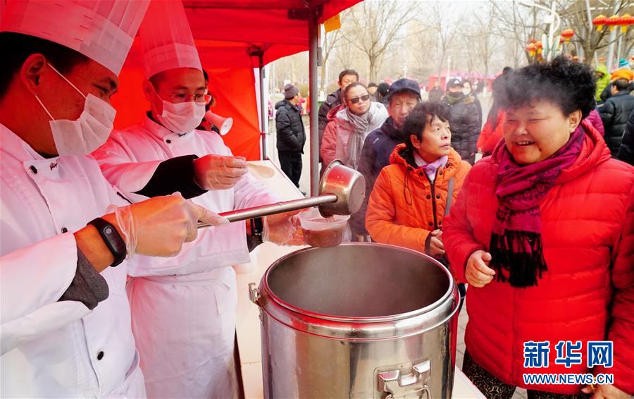 1月12日,人們在年貨大集上排隊(duì)品嘗臘八粥。