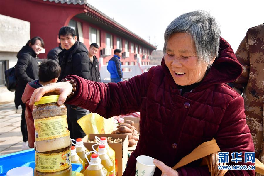當(dāng)日,河南省魯山縣觀音寺鄉(xiāng)西桐樹莊村土特產(chǎn)年貨展銷活動在河南魯山阿婆寨風(fēng)景區(qū)門口舉行。近年來,依托鄉(xiāng)村旅游的不斷發(fā)展,不少貧困山村特產(chǎn)走出大山。