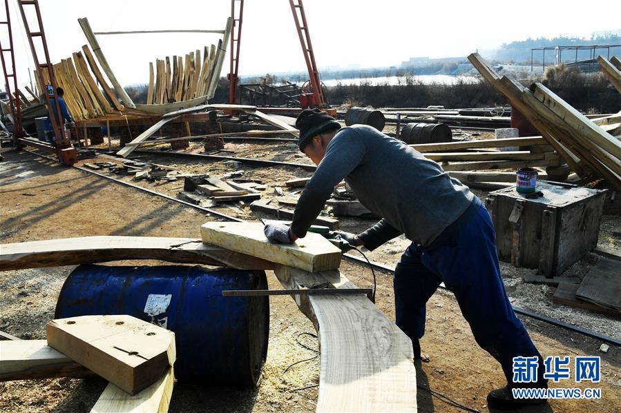 在青島紅雙木造船廠,一位造船師傅在加工構(gòu)件(1月10日攝)。新華社記者 李紫恒 攝