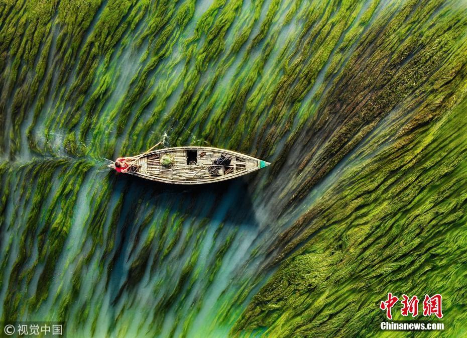 1月14日訊(具體拍攝時間不詳),孟加拉國烏拉帕拉,漁船在水流和藻類的映襯下前行,畫面看起來就像水彩畫一般。圖片來源:視覺中國