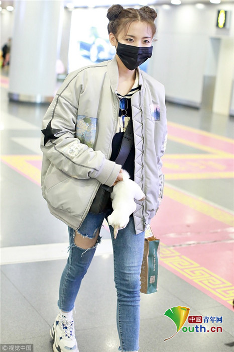 2019年1月14日,北京,楊超越現(xiàn)身機場。她扎哪吒頭活力十足,甩玩偶淘氣回眸,穿破洞褲露美腿,披面包服似自帶鼓風機。