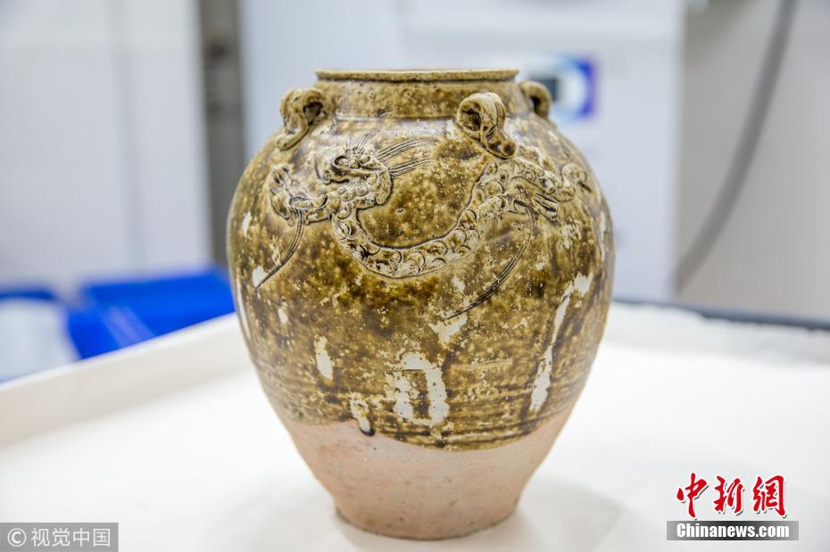 近日,廣東省博物館文物保護(hù)科技中心出水文物保護(hù)實驗室里,一個修復(fù)后的出水明代四系醬釉龍紋罐。譚慶駒 攝 圖片來源:視覺中國
