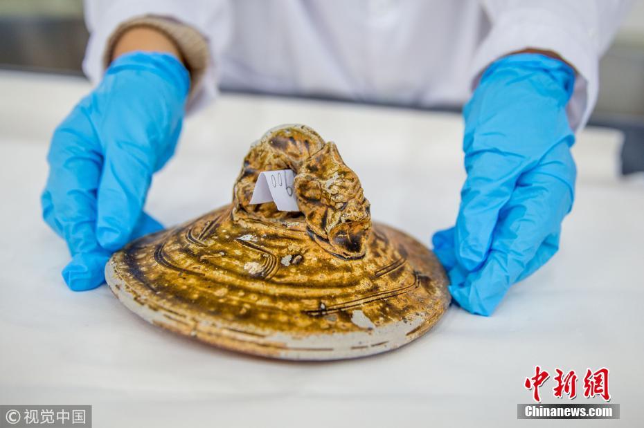 近日,廣東省博物館文物保護(hù)科技中心出水文物保護(hù)實驗室里,一件修復(fù)后的出水明代老虎醬釉罐的蓋子。譚慶駒 攝 圖片來源:視覺中國