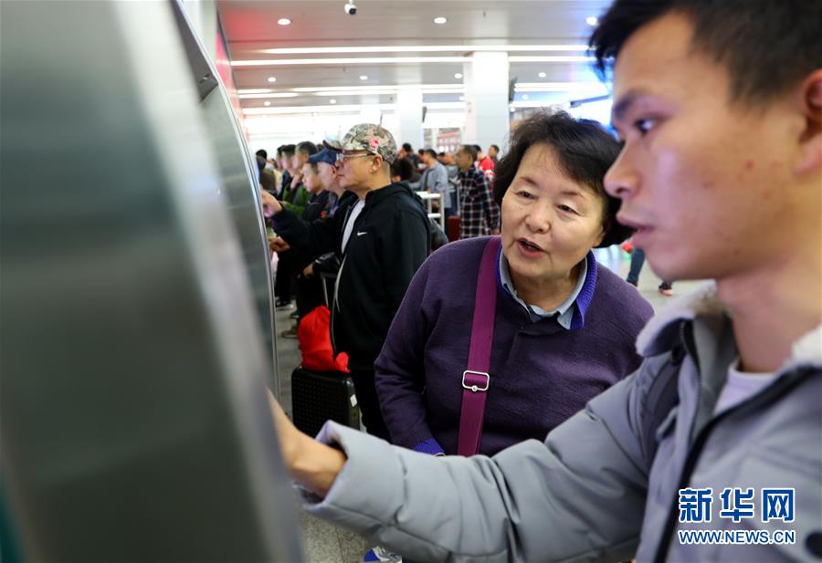 1月15日,廣東湛江青年許東濱(右)在廣州火車站售票大廳內(nèi)的自助售票終端上買完車票后,順便幫助一位老人查詢車票信息。 為適應(yīng)互聯(lián)網(wǎng)購票旅客比重持續(xù)上升趨勢,廣州火車站在籌備2019年春運票務(wù)業(yè)務(wù)時,優(yōu)化互聯(lián)網(wǎng)購票取票和退改簽業(yè)務(wù)辦理流程設(shè)計,提升效率,方便旅客出行。 新華社記者劉大偉攝