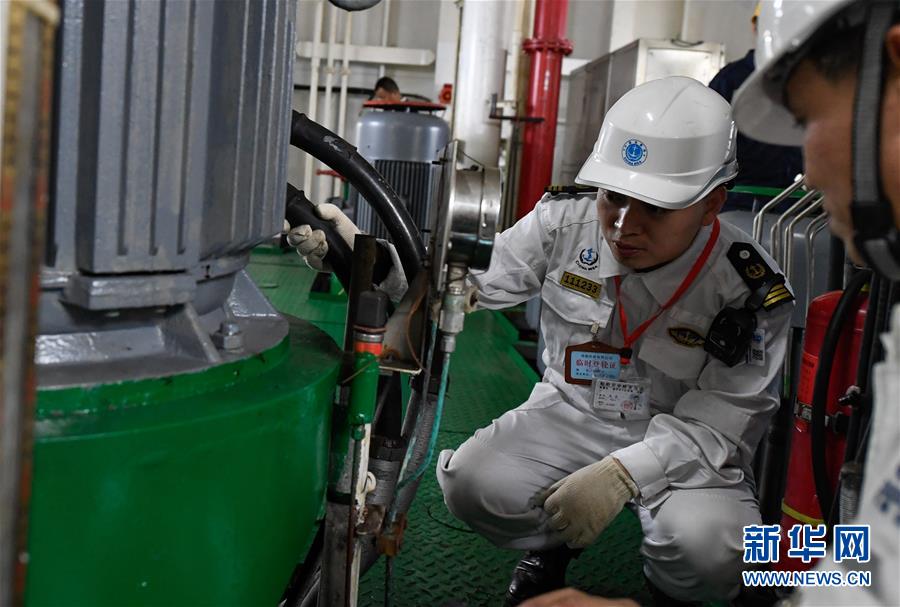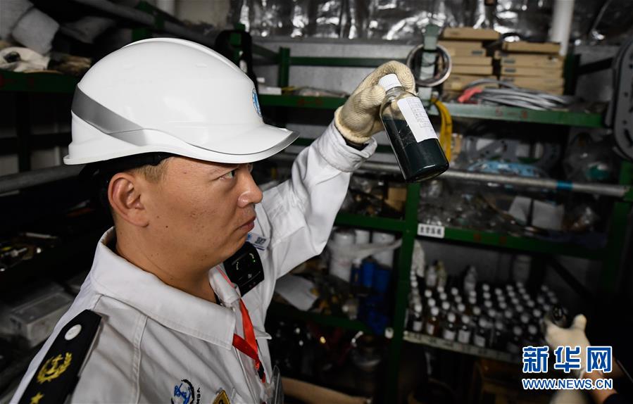 1月15日,??诤J戮止ぷ魅藛T在粵海鐵4號(hào)客滾船上檢查油樣。新華社記者 楊冠宇 攝