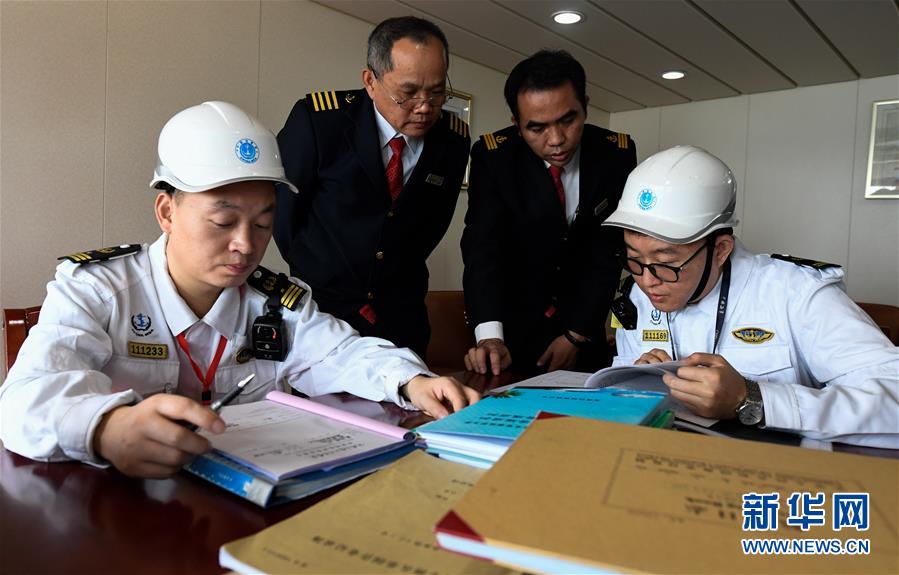 1月15日,??诤J戮止ぷ魅藛T在粵海鐵4號(hào)客滾船上檢查文書文件。 新華社記者 楊冠宇 攝
