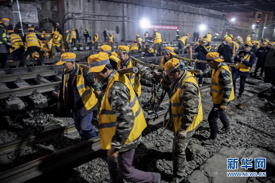 1月15日凌晨,中鐵十一局施工人員在西安站改現(xiàn)場抬運(yùn)鋼軌。新華社記者陶明攝