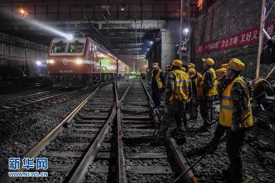 1月15日凌晨,中鐵十一局施工人員在西安站改現(xiàn)場等待列車通過,準(zhǔn)備進(jìn)行施工。新華社記者陶明攝