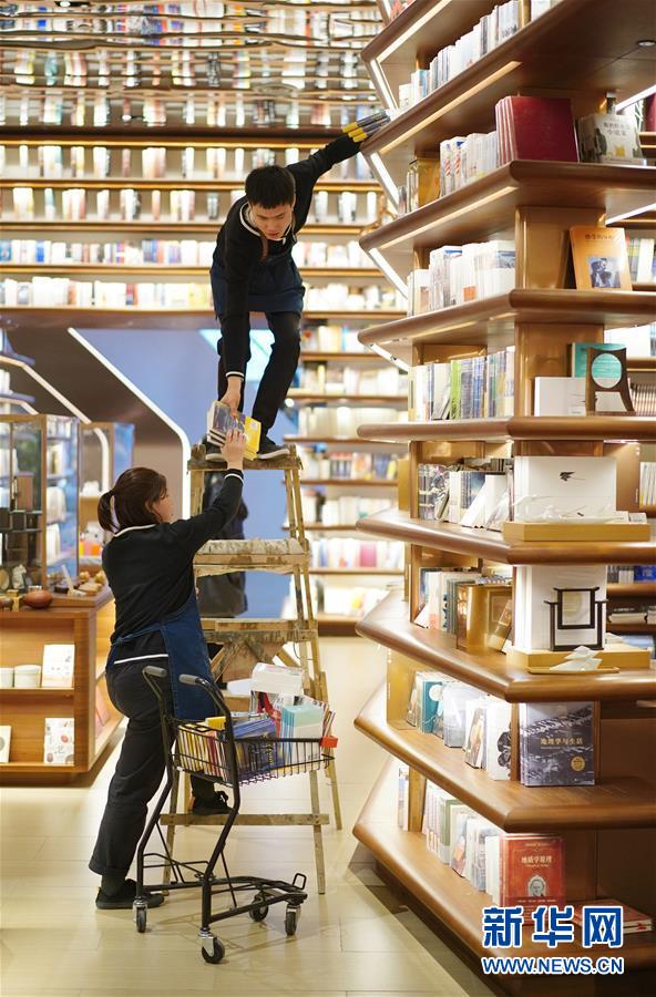 1月14日,西安高新區(qū)一家大型書店的工作人員在店內(nèi)整理書籍。