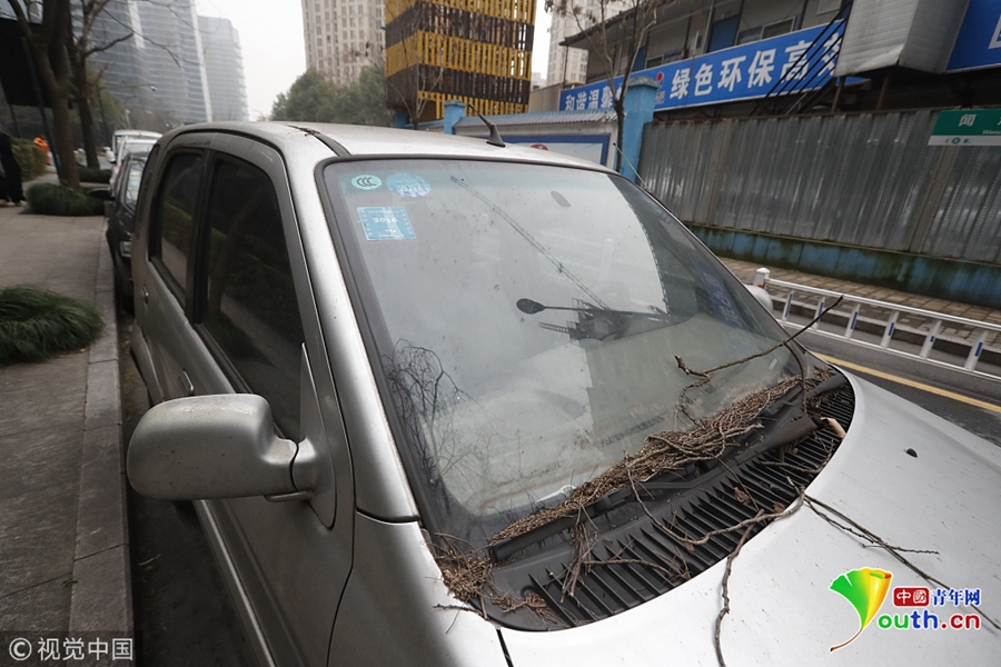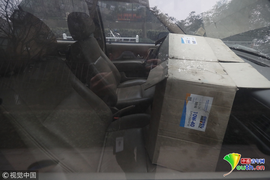 因為是免費停車位,就成為僵尸車的天堂。粗粗數(shù)了一遍,至少有10余輛汽車裹著車衣,被落葉等臟物覆蓋;有的車最后的年檢標志是3年前,車胎漏氣,車內(nèi)也是堆著雜物。