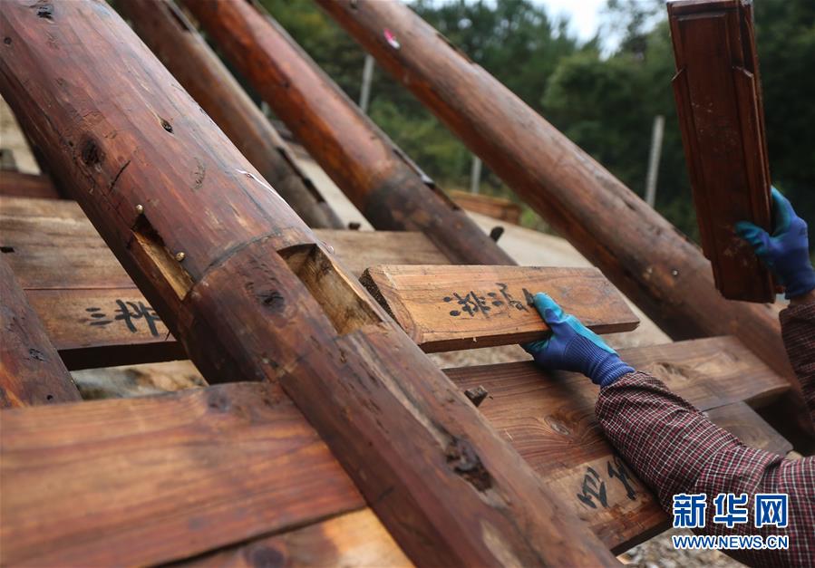 1月15日,在廣西融水苗族自治縣融水鎮(zhèn)夢嗚苗寨,一名工人將苗族吊腳樓的主要結構進行“復原”安裝。新華社記者 陳君清 攝