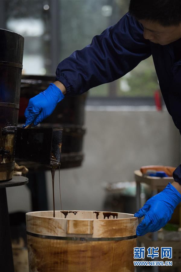 1月15日,吳榮強(qiáng)在龍泉市牛頭嶺村“七分醉”工作室精制大漆。 新華社記者翁忻旸攝