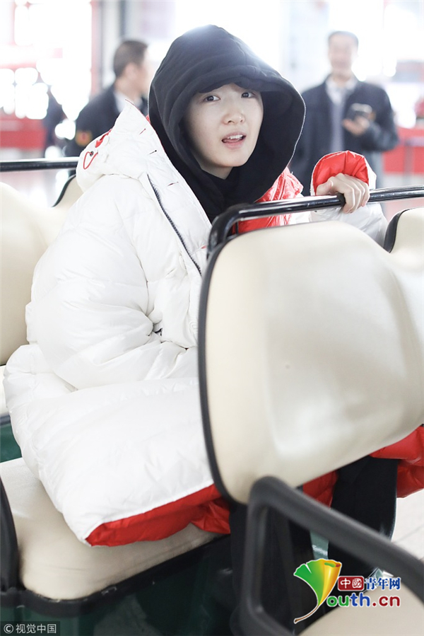 周冬雨連衣帽罩頭襯托小臉 下巴擱在行李車推桿呆萌可愛