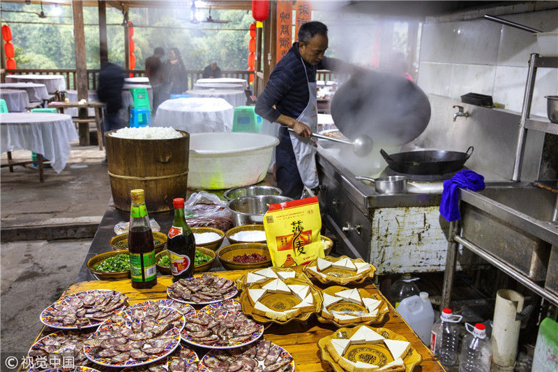 2019年1月26日,重慶中山古鎮(zhèn),880桌“千米長(zhǎng)宴”5萬人共品年味。街坊們?cè)陬^天就開始準(zhǔn)備各種菜肴與小吃。