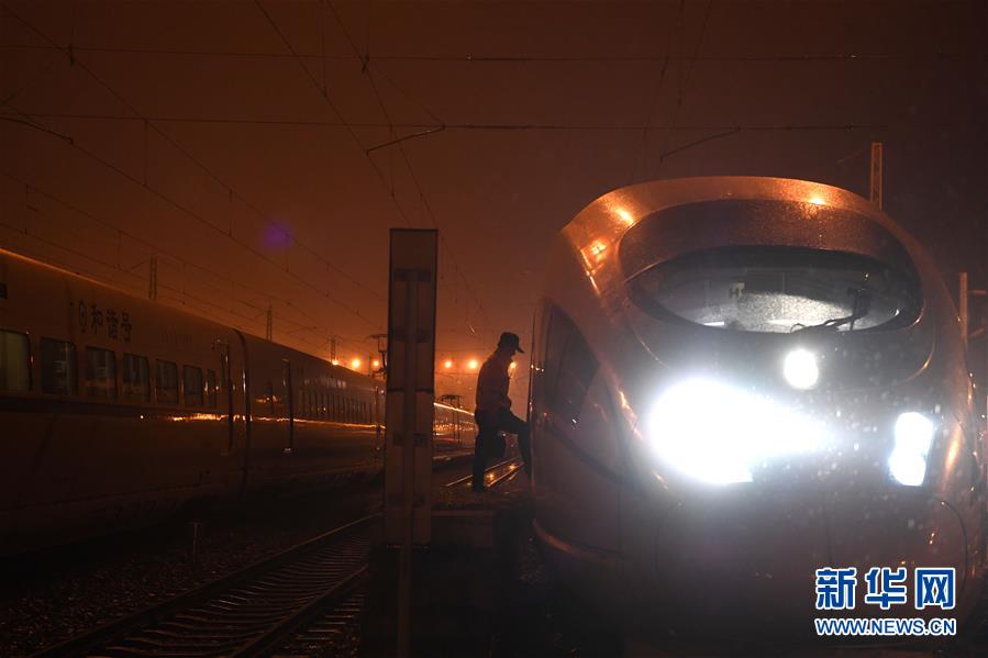 1月29日,王瑞在合肥南動(dòng)車運(yùn)用所登上一輛動(dòng)車準(zhǔn)備調(diào)車作業(yè)。新華社記者劉軍喜攝