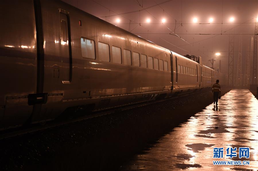 1月29日,王瑞在合肥南動(dòng)車運(yùn)用所存車場(chǎng)走向下一輛動(dòng)車。新華社記者劉軍喜攝
