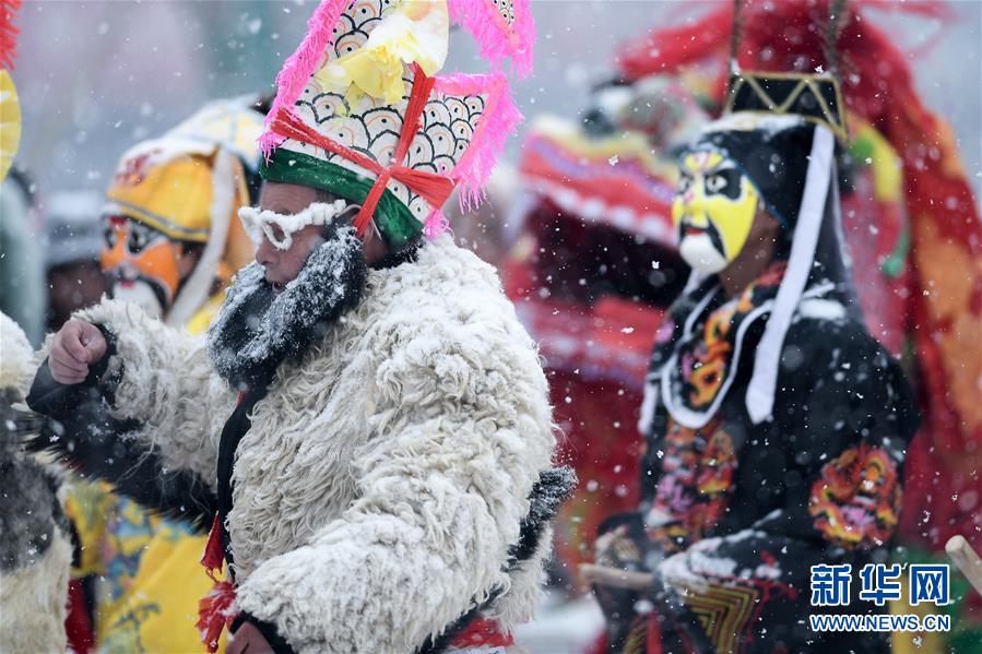 2月16日,社火隊(duì)演員在青海省大通回族土族自治縣文化廣場(chǎng)表演。新華社記者吳剛攝