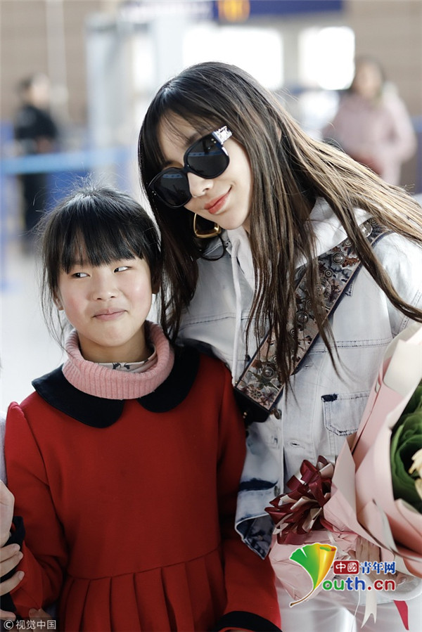 2019年2月24日,上海,楊穎現(xiàn)身機(jī)場(chǎng)。她全白套裝現(xiàn)身身材十分纖細(xì),手捧粉絲送的花與小粉絲合影,十分親切。
