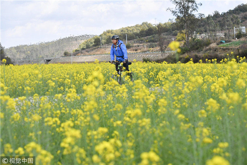 2019年3月1日,游客在花海中騎行。近日,位于云南省安寧市的大片油菜花進(jìn)入盛花期,吸引民眾到此賞花。