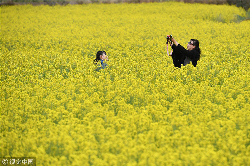 2019年3月1日,游客在花海中拍照。近日,位于云南省安寧市的大片油菜花進(jìn)入盛花期,吸引民眾到此賞花。