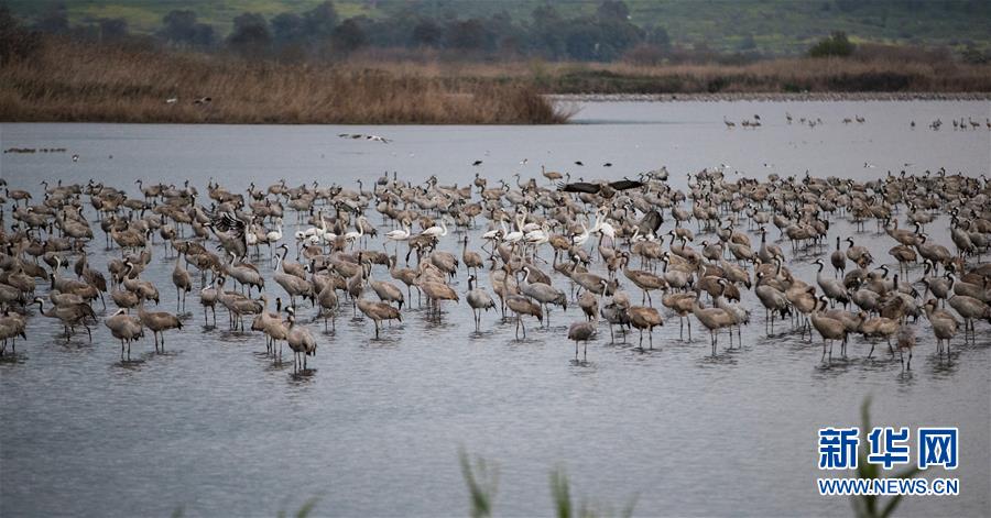 3月7日,在以色列阿格蒙胡拉鳥類和自然公園,幾只灰鶴在水邊休息。新華社記者郭昱攝