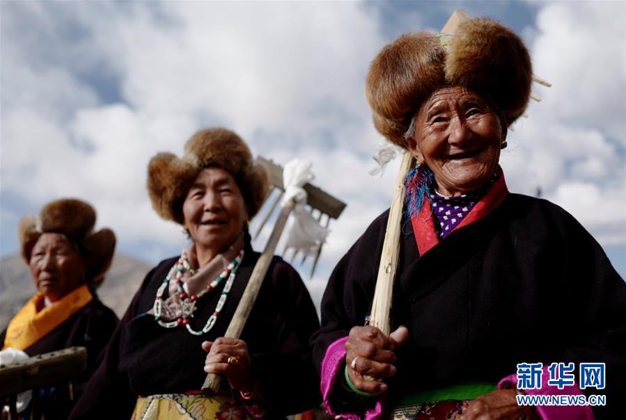 3月16日,山南市乃東區(qū)門中崗村村民在開耕儀式上。 當日,西藏各地男女老幼身著節(jié)日盛裝,駕著一輛輛由彩旗、花朵裝扮一新的拖拉機,涌向待墾的農(nóng)田,載歌載舞迎來一年一度的開耕儀式。 新華社記者 覺果 攝