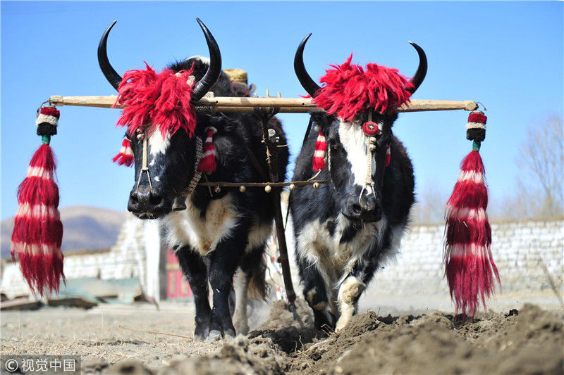 圖為白朗縣洛江鎮(zhèn)村民開耕犁出新年的第一壟青稞田,據(jù)悉,每年開耕節(jié)上,農(nóng)牧民都會裝扮自家的耕牛。