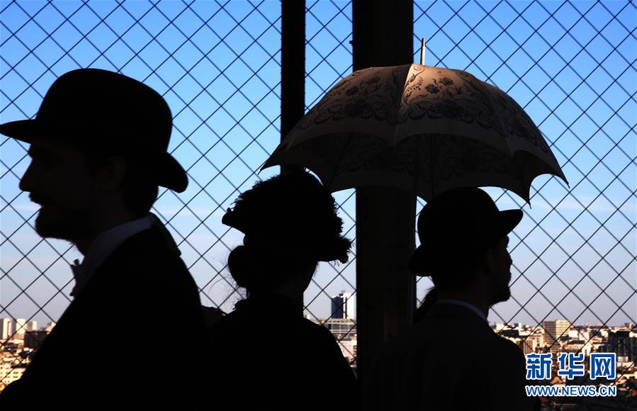 3月30日,在法國巴黎,音樂劇《300米高塔》的演員身著19世紀服裝站在埃菲爾鐵塔一層平臺上。于1889年3月31日正式落成的法國巴黎埃菲爾鐵塔迎來130歲生日。從30日起,包括演出、冒險游戲、圖片展在內的多項活動在埃菲爾鐵塔舉行,為這座宏偉建筑慶生。新華社記者 高靜 攝