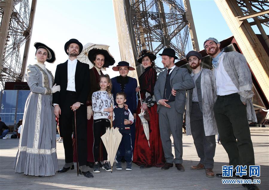 3月30日,在法國巴黎,音樂劇《300米高塔》的演員身著19世紀(jì)服裝在埃菲爾鐵塔一層平臺(tái)與游客合影。于1889年3月31日正式落成的法國巴黎埃菲爾鐵塔迎來130歲生日。從30日起,包括演出、冒險(xiǎn)游戲、圖片展在內(nèi)的多項(xiàng)活動(dòng)在埃菲爾鐵塔舉行,為這座宏偉建筑慶生。新華社記者 高靜 攝