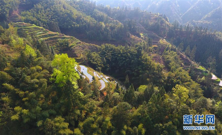 這是廣西融水苗族自治縣桿洞鄉(xiāng)黨鳩村的田園春色(3月29日無人機(jī)拍攝)。