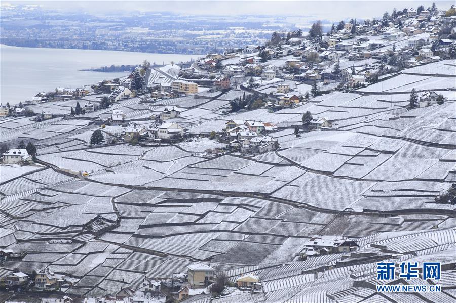 這是4月4日在瑞士西部拉沃地區(qū)拍攝的雪后梯田式葡萄園美景。