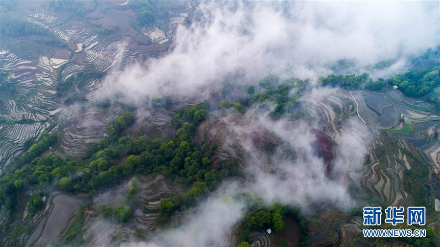 這是在云南省元陽縣拍攝的傍晚時(shí)分的哈尼梯田美景(4月3日無人機(jī)拍攝)。哈尼梯田位于云南省哀牢山南部,以哈尼族為主的當(dāng)?shù)厝罕娗О倌陙砩幌⒃诖蟮厣稀暗窨獭背鲞@一農(nóng)耕文明奇觀。春日里,漫山的水稻梯田與云海、森林、村莊形成一幅美麗的畫卷,吸引眾多海內(nèi)外游客前來觀賞。新華社記者 胡超 攝