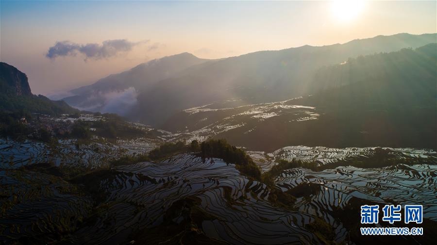 這是在云南省元陽縣拍攝的晨曦中的哈尼梯田美景(4月4日無人機(jī)拍攝)。哈尼梯田位于云南省哀牢山南部,以哈尼族為主的當(dāng)?shù)厝罕娗О倌陙砩幌⒃诖蟮厣稀暗窨獭背鲞@一農(nóng)耕文明奇觀。春日里,漫山的水稻梯田與云海、森林、村莊形成一幅美麗的畫卷,吸引眾多海內(nèi)外游客前來觀賞。新華社記者 胡超 攝