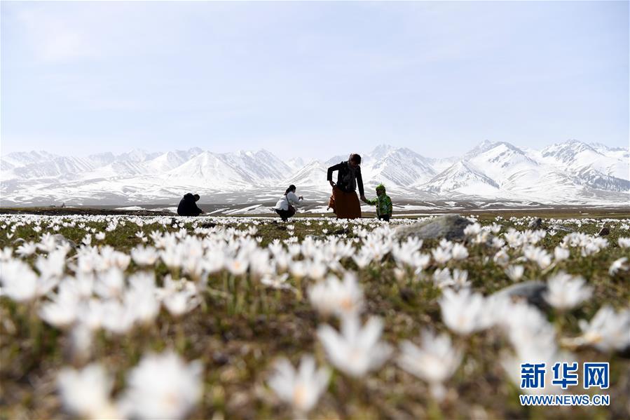 4月4日,游客在新疆那拉提景區(qū)雪山腳下拍攝盛開的野百合。