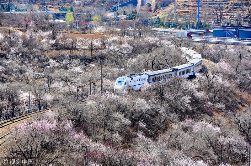 2019年3月22日,北京居庸關(guān)附近的山花盛開,S2線列車穿行在花海之中,構(gòu)成一幅美麗的畫面。時(shí)永平/千龍圖像/視覺(jué)中國(guó) 編輯/陳進(jìn)