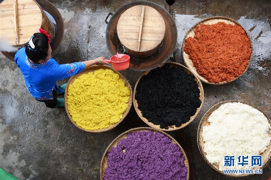 4月17日,在貴州省臺江縣姊妹街哆蝶五彩姊妹飯體驗店,苗家婦女在蒸煮五彩“姊妹飯”。新華社記者 楊文斌 攝