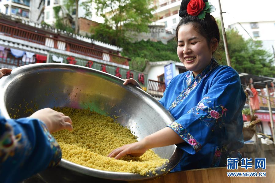 4月16日,在貴州省臺江縣姊妹街哆蝶五彩姊妹飯?bào)w驗(yàn)店,苗家婦女在制作五彩“姊妹飯”。新華社發(fā)(劉開福 攝)
