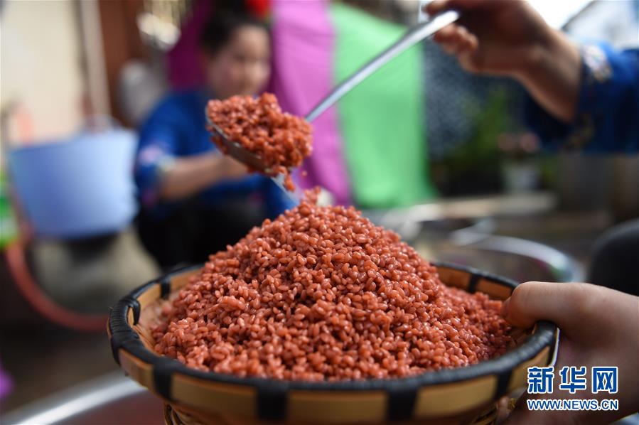 4月16日,在貴州省臺江縣姊妹街哆蝶五彩姊妹飯體驗店,苗家婦女展示制作五彩“姊妹飯”的糯米。新華社發(fā)(劉開福 攝)