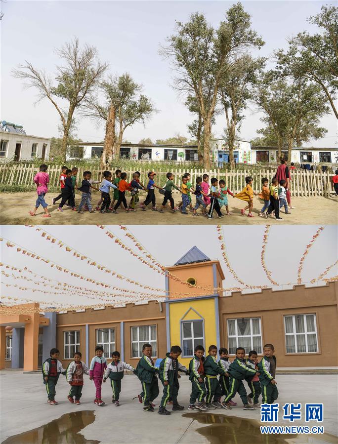 拼版照片:上圖為新疆于田縣達(dá)里雅布依鄉(xiāng)小學(xué)的學(xué)生走在校園里(2018年9月5日攝);下圖為學(xué)生們在達(dá)里雅布依小鎮(zhèn)易地扶貧安置點(diǎn)的新校舍前(2019年3月20日攝)。新華社記者 胡虎虎 攝