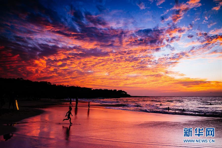 這是2014年12月22日在美國夏威夷州夏威夷大島科納附近拍攝的日落時分的火燒云和海灘。 新華社記者朱煒攝
