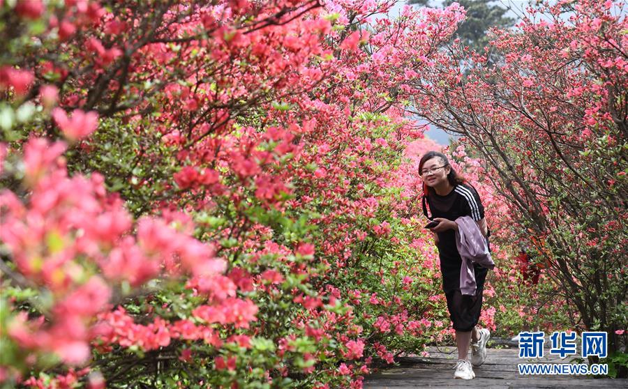 4月25日,游客在龜峰山杜鵑花海中游玩。 近日,湖北省麻城市龜峰山的10萬(wàn)畝古杜鵑盛開,大量游客前來(lái)賞花觀景。 新華社記者 程敏 攝