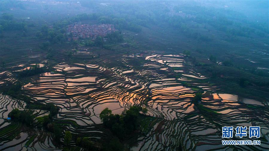 這是在云南省元陽縣拍攝的傍晚時(shí)分的哈尼梯田美景(4月3日無人機(jī)拍攝)。 新華社記者 胡超 攝