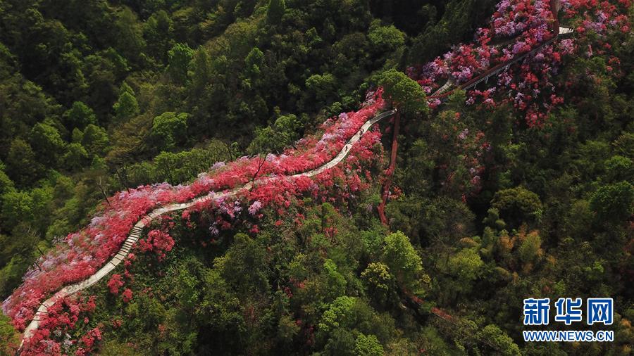 安徽省岳西縣天峽風(fēng)景區(qū)內(nèi)的杜鵑花競相綻放(4月12日無人機(jī)拍攝)。 新華社記者 張端 攝