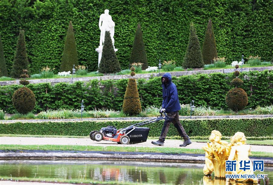 4月25日,在法國(guó)巴黎近郊,園丁在凡爾賽花園內(nèi)割草。新華社記者高靜攝